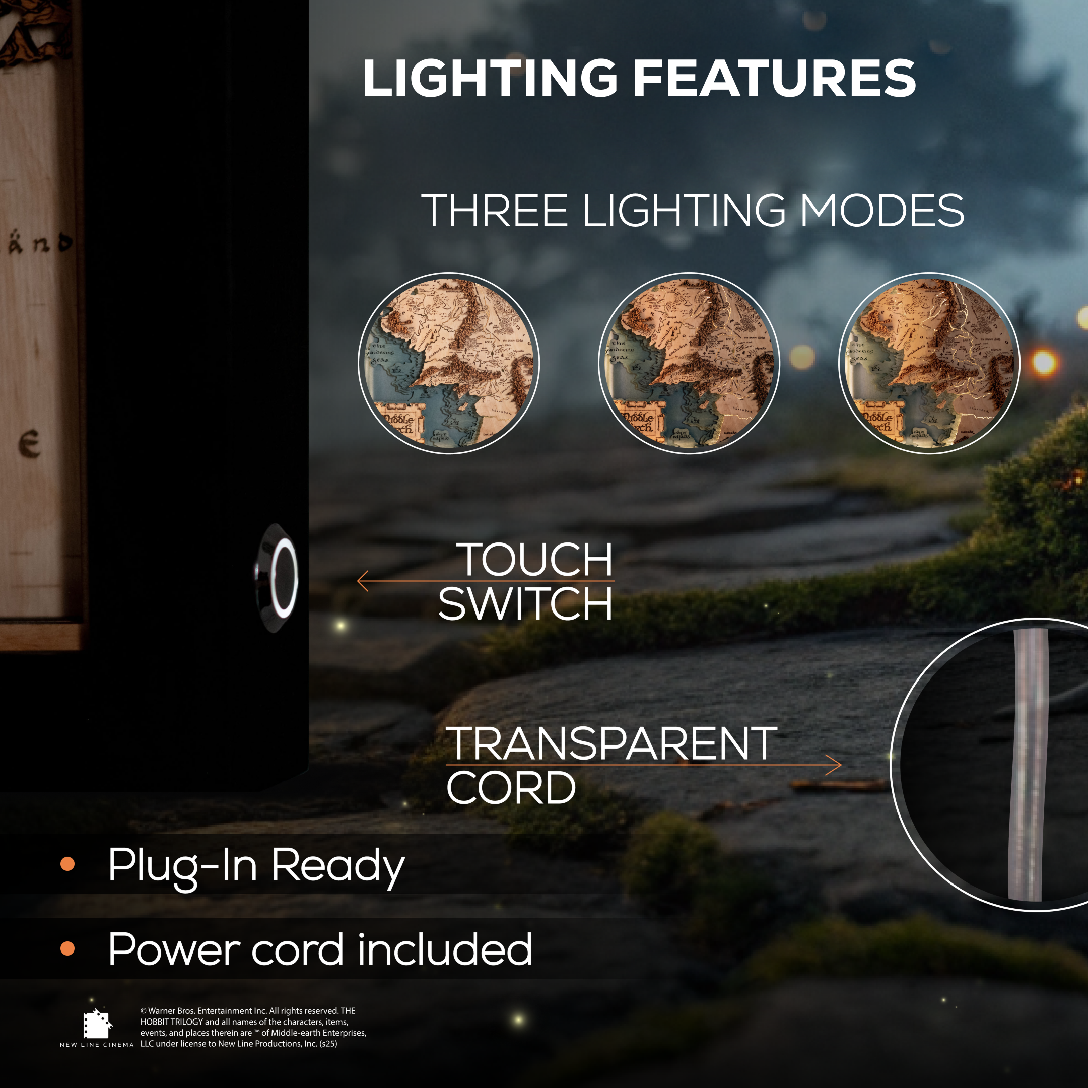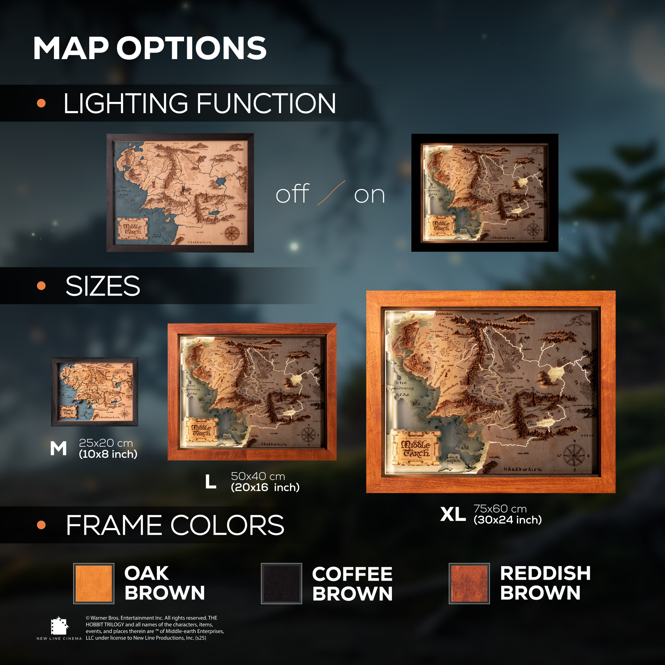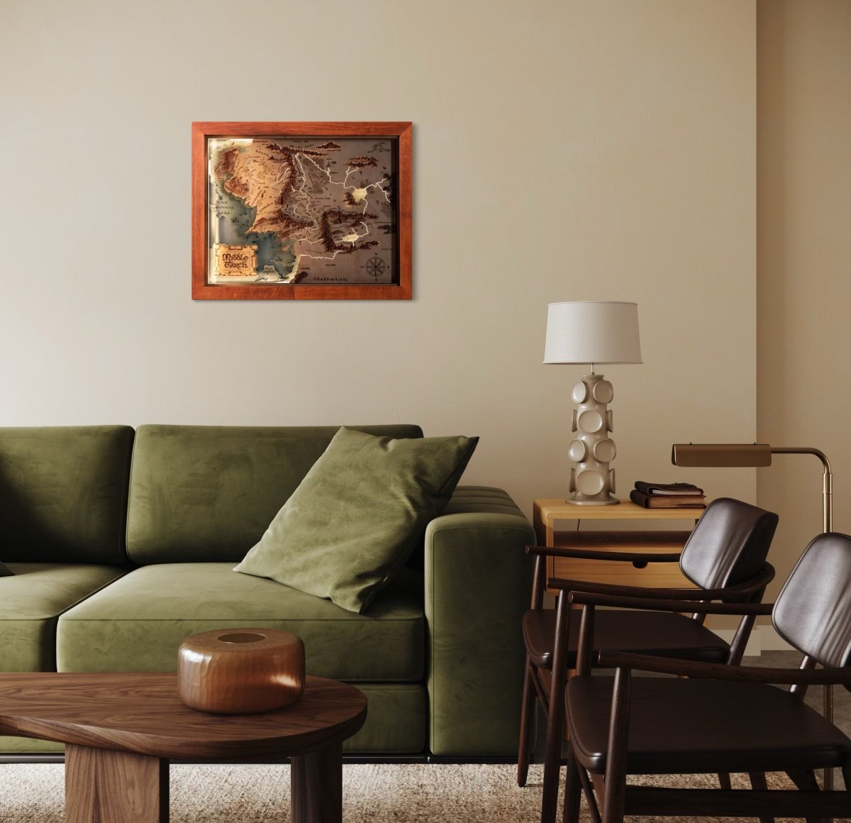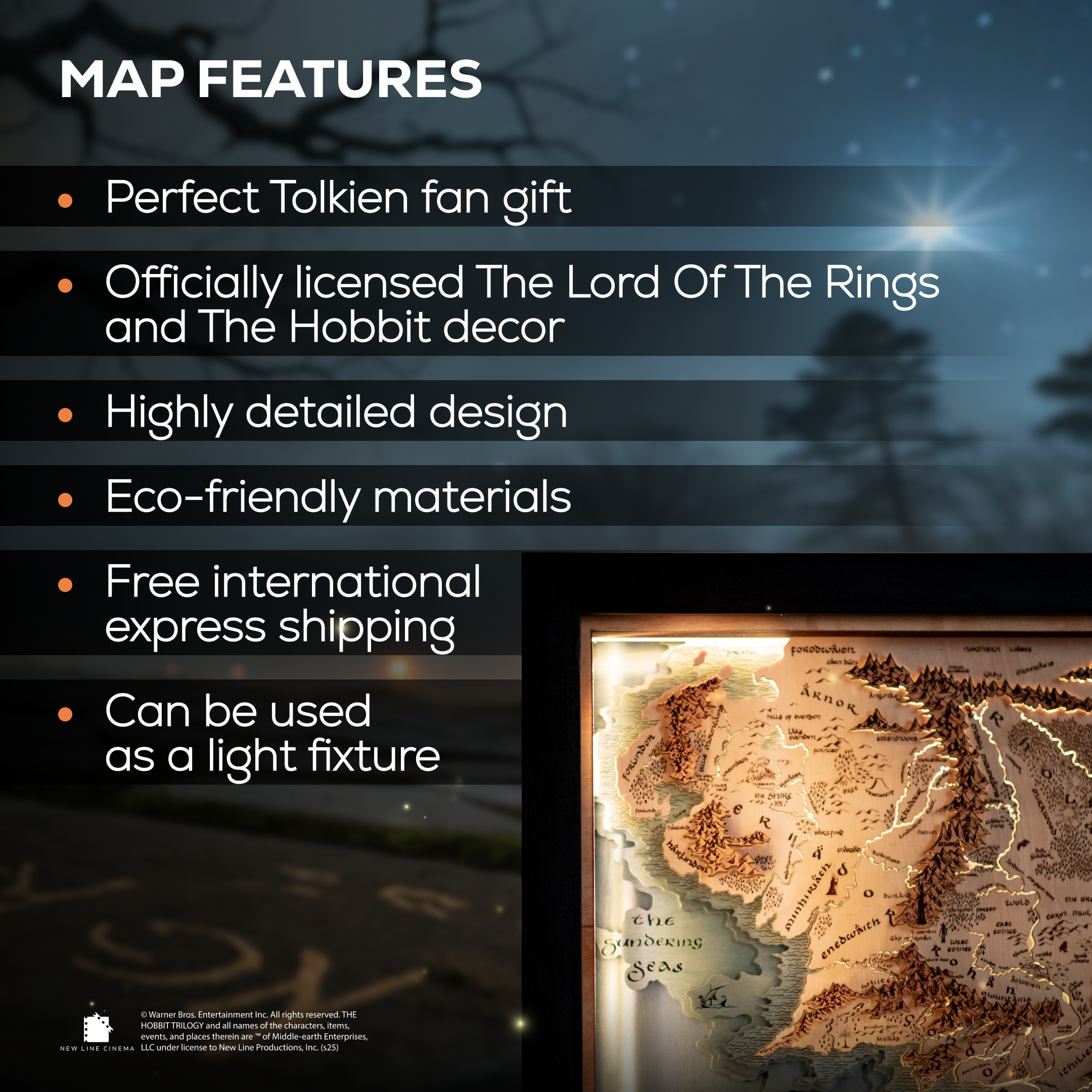 Middle Earth™ 3D Wood Map, inspired by The Lord Of The Rings and The Hobbit. Dive deep into the legendary adventures of Frodo, Aragorn, Gandalf, and more. This enchanting map not only elevates your home's ambiance but places you right in the heart of the epic tales. Limited stock - grab yours now and be part of the adventure!
