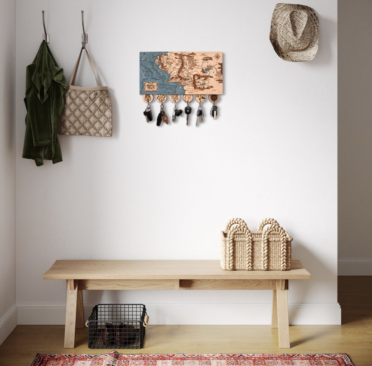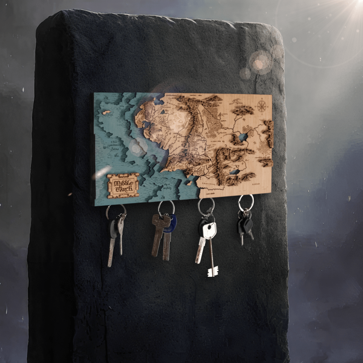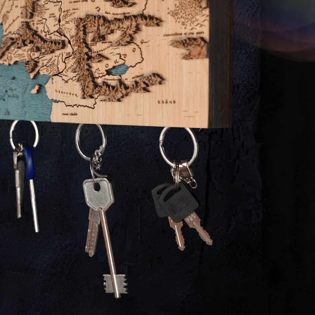 The Middle Earthkey holder features six layers and a set of magnetic keychains: Sizes & Weights • M (7"x4"x1" / 22x11x2,5 cm) - 3 keychains • L ( 12"x6"x1" / 30x15x2,5 cm) - 4 keychains • XL (15"x8"x1" / 39x20x2,5 cm) - 6 keychains