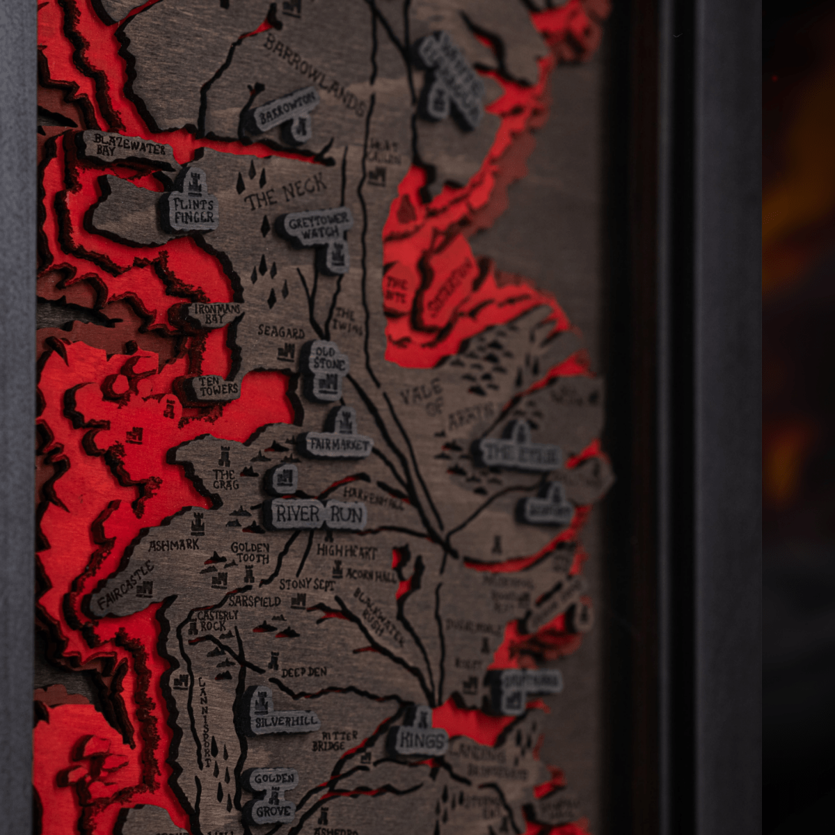 • You can personalize the back of your map of Westeros with an inscription simply by entering the desired phrase in the order note. •You will receive aframe and plexiglassalong with the Westeros 3D Wood Map. So you can easily hang it in your home, and it will please you and your family for many years.